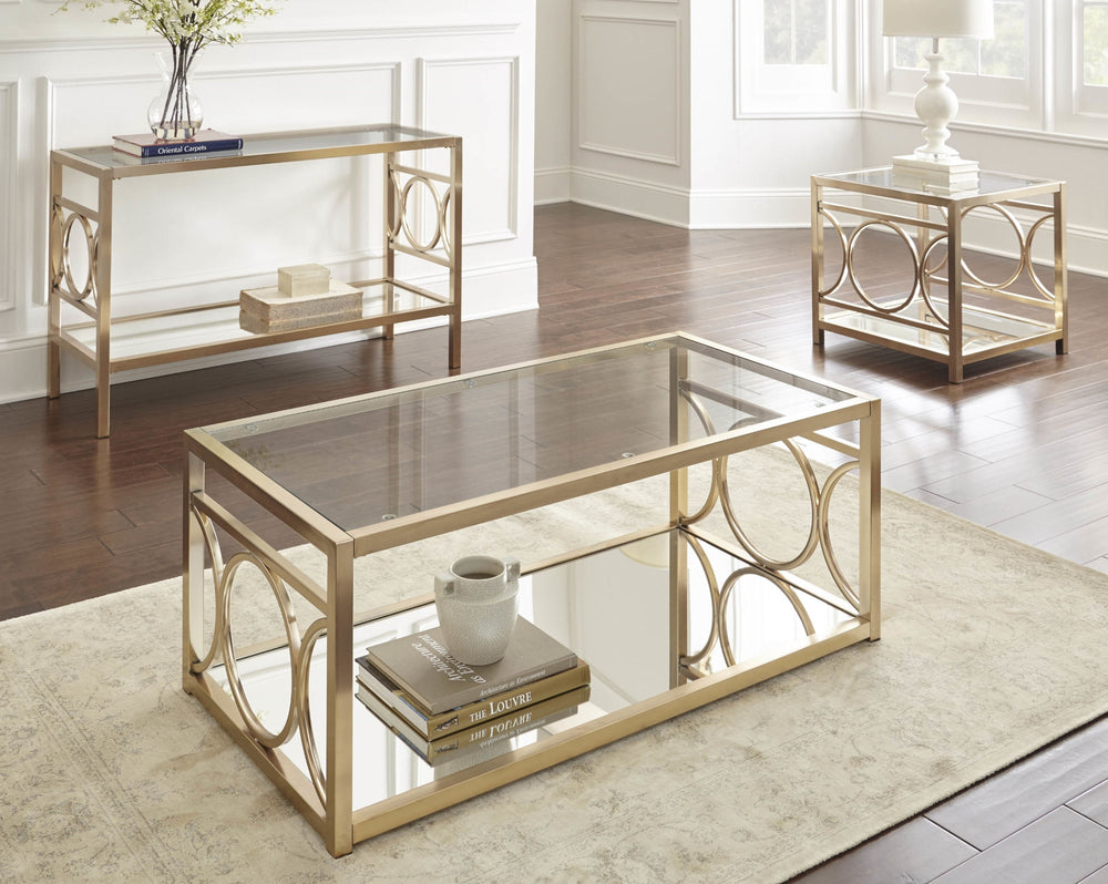 Elevate your elegant living room decor with this enchanting coffee table. The metal frame features a polished goldtone finish and circular accents on the side panels for a glam look. In addition to the clear tempered glass top, a mirrored glass lower shelf provides additional storage space.