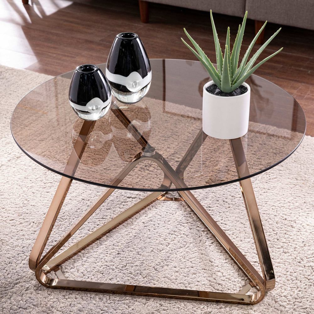 Your home gets a modern update with this glass-top coffee table. Three champagne hued triangles craft a geometric base while the smoked glass tabletop adds a touch of retro flair. Slide this round table alongside your sofa to hold your magazines, or tuck between a pair of cozy armchairs to entertain family and friends. Round out your design with this contemporary coffee table.