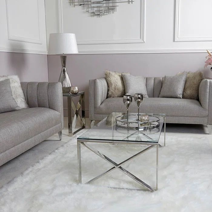 Center metal table for living room, crafted in a stainless-steel frame, it showcases a silver hue with a rectangular design on the table ends finished with a tempered clear glass table top.