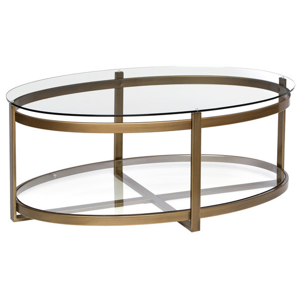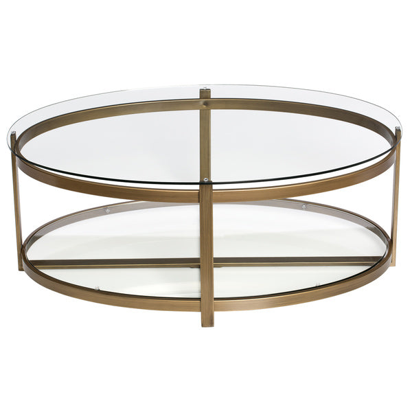 Highlight your living room with this retro-themed coffee table. showcasing a sleek, minimalist, this coffee table exudes timeless elegance with its oval metal frame and clear glass surface.
