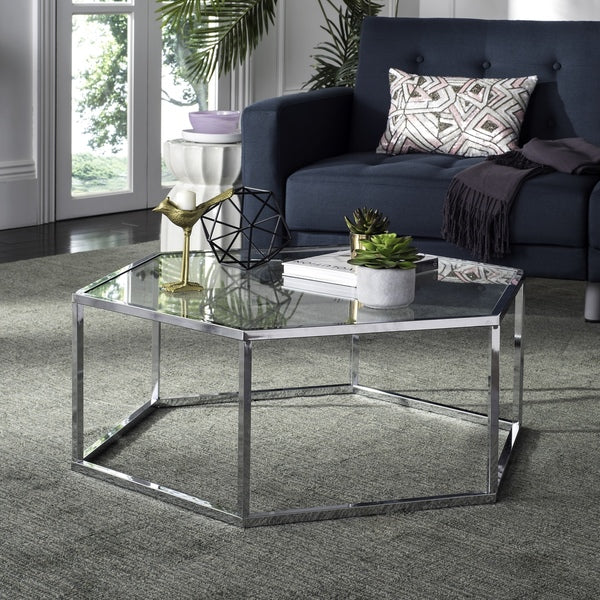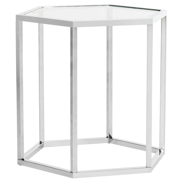 Designed for the soulful contemporary home, this glass end table bears the touch of modern sculpture. Minimalism at its finest, its sleek metallic chrome finish elegantly frames each of its six plate glass sides, creating easy access at any angle.