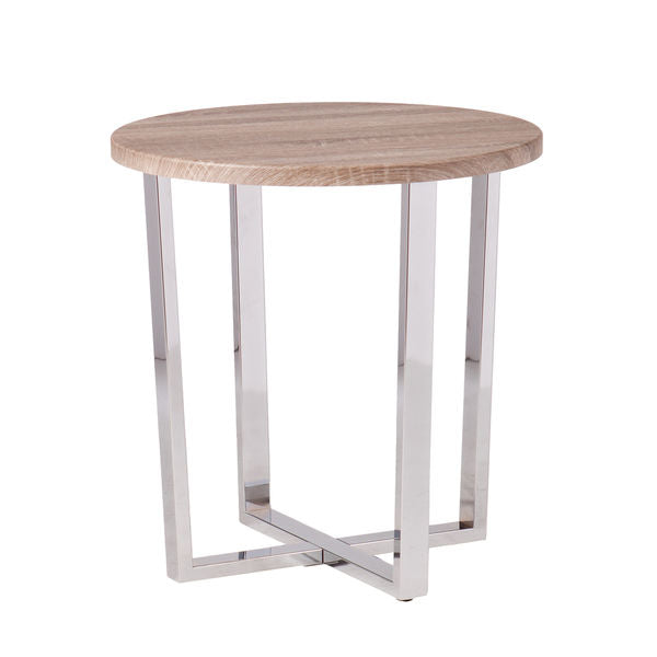 This end table combines fashion with function. Keep last night’s red at bay with the scratch and spill resistant scraped resin surface. Glittering chrome-plated frame winks at mod inspiration while launching the table to lighthearted heights. Use this transitional end table in your modern living space to instantly implement casually chic flair.